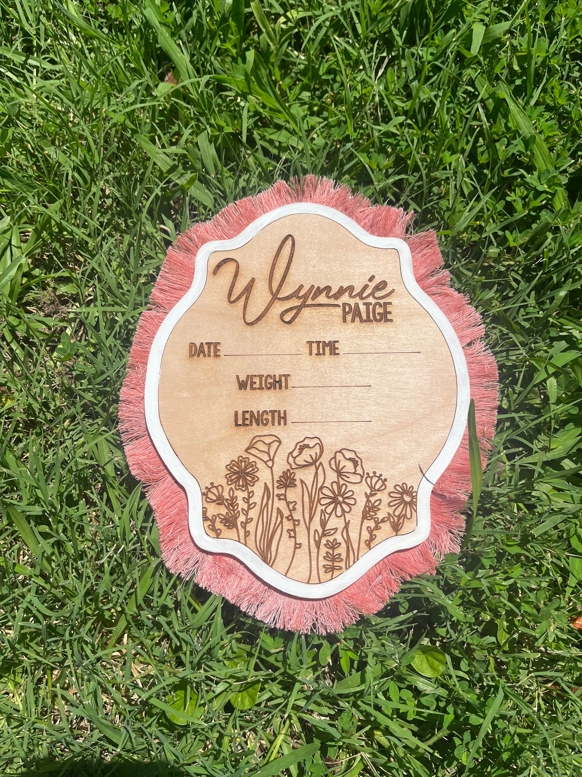 This 6” piece will record Wynnie’s birthday facts and be a lovey accent during her fist pictures. It is engraved with her wildflower theme & accented with a lovely pink fringe.