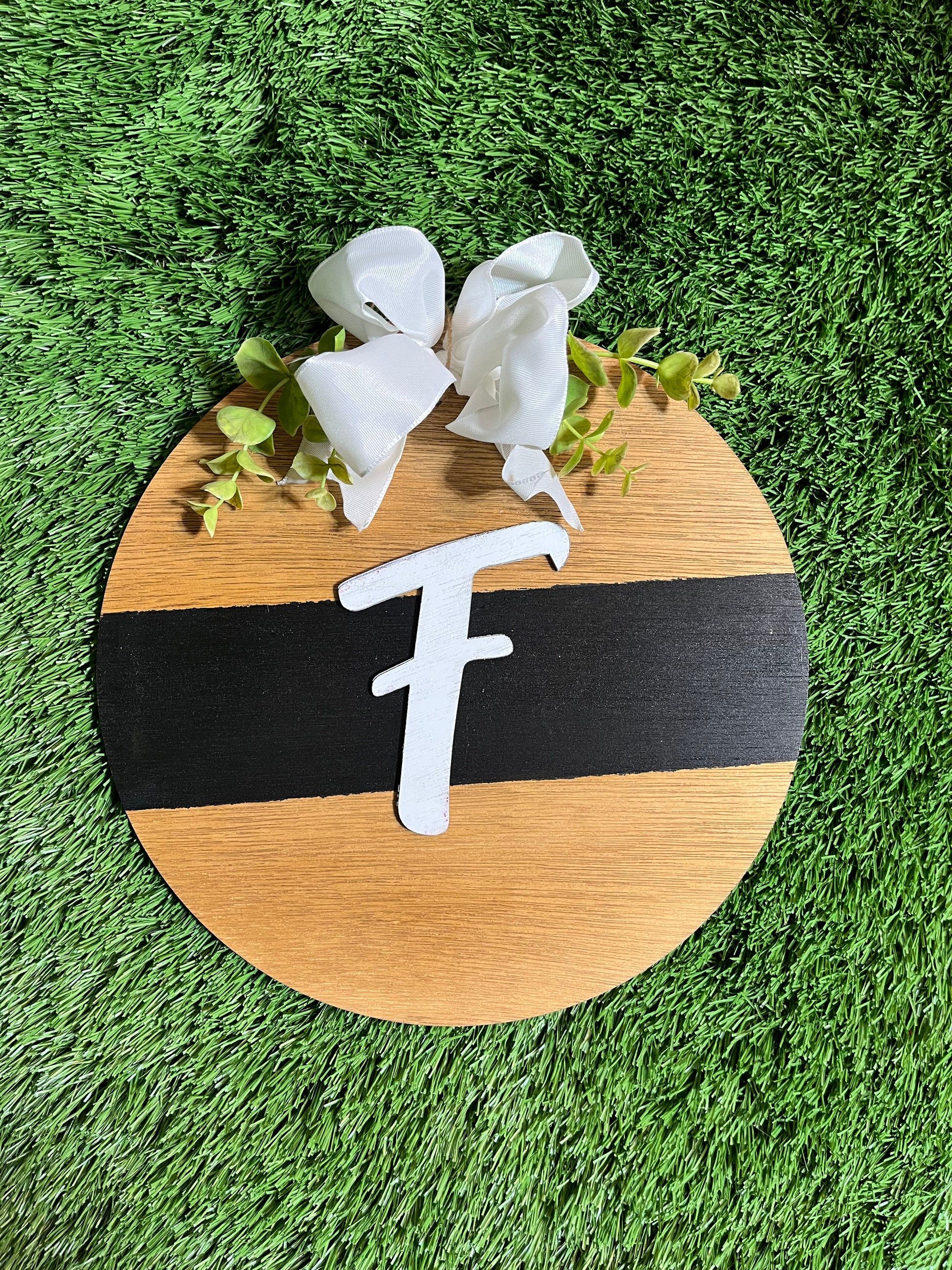 Welcome guests with style and charm using this Classic Initial Door Hanger! Boasting a timeless black stripe and an eye-catching initial, plus a vibrant burst of greenery plus a pretty bow, this hanger lets visitors know they've arrived at a special place. Come on in!