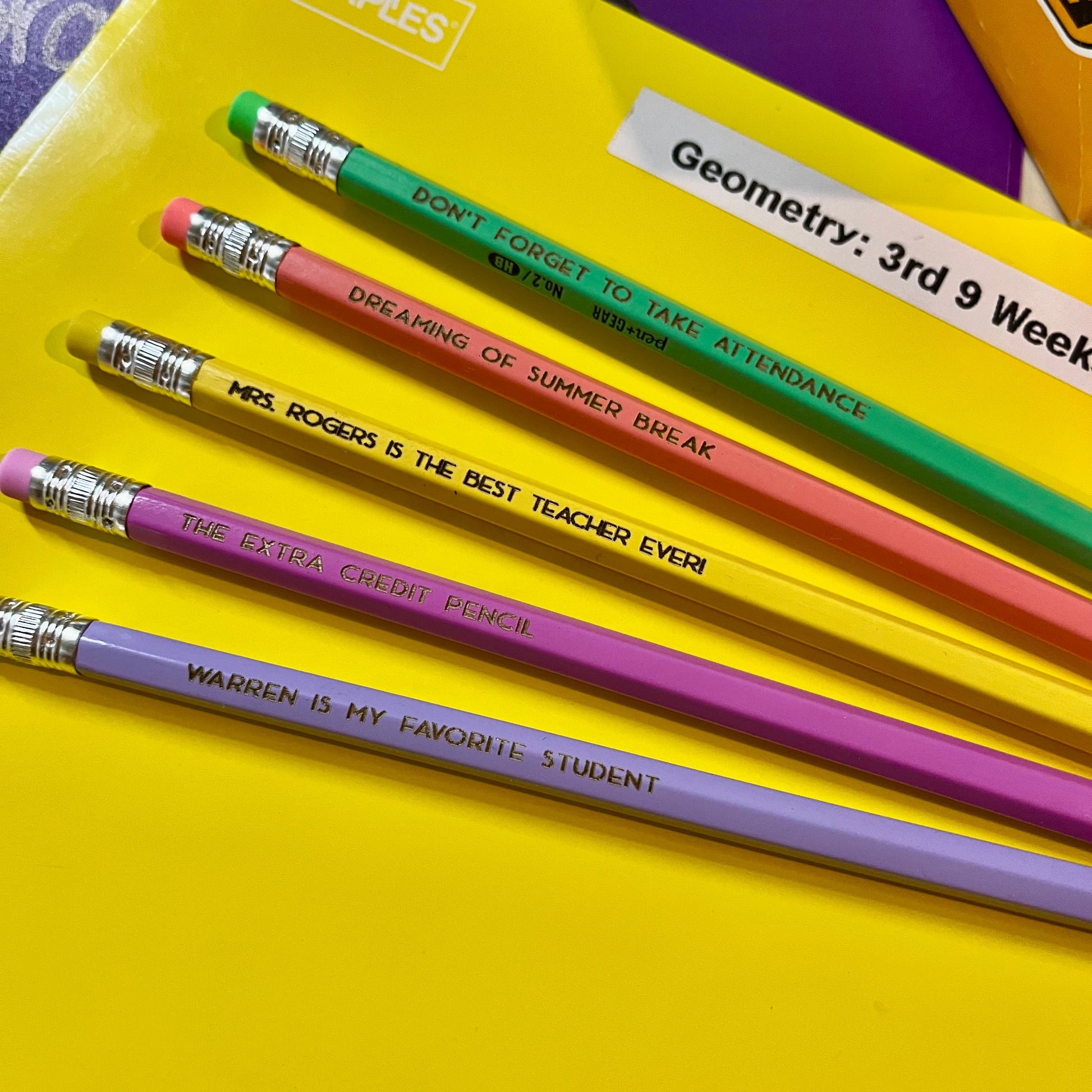 Make your favorite teacher smile with our Engraved Pencils - Teacher Edition! Personalized with funny or sweet messages, these pencils are the perfect gift for any educator. Available in sets of 5 in both classic yellow and fun multicolor options. Show your appreciation with a practical present they'll love!