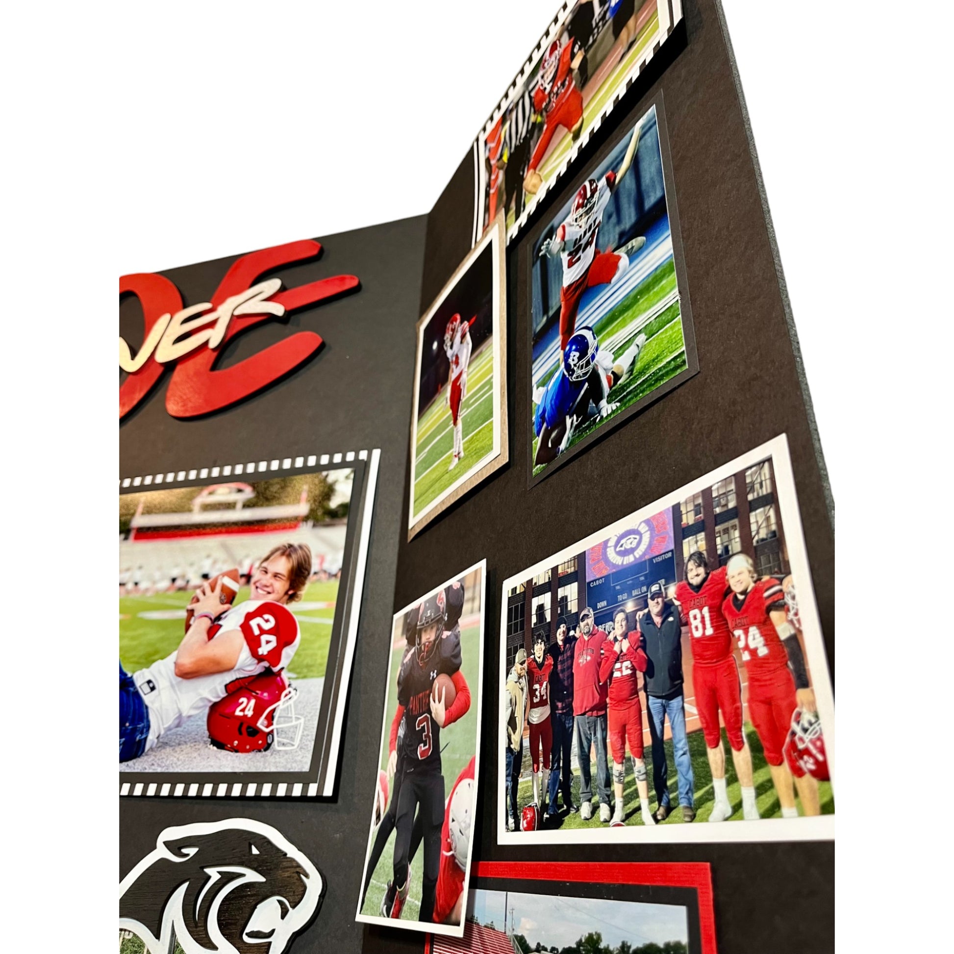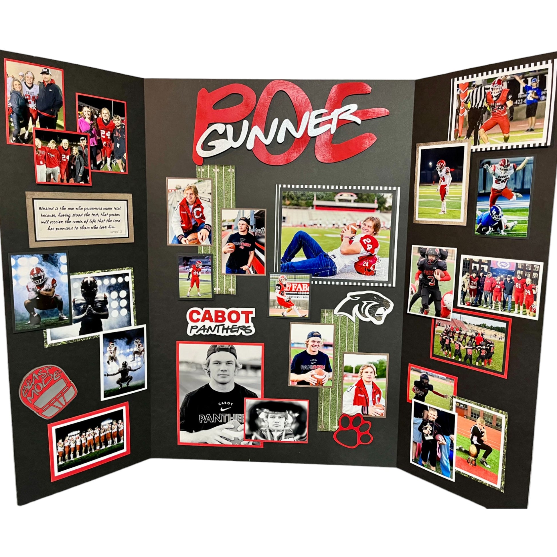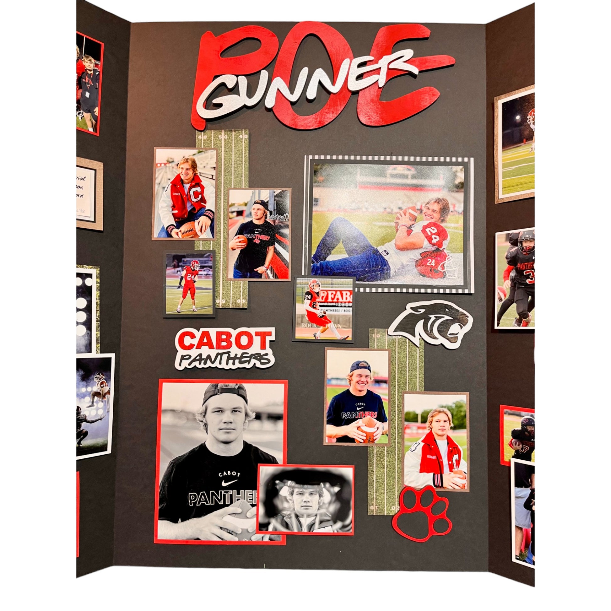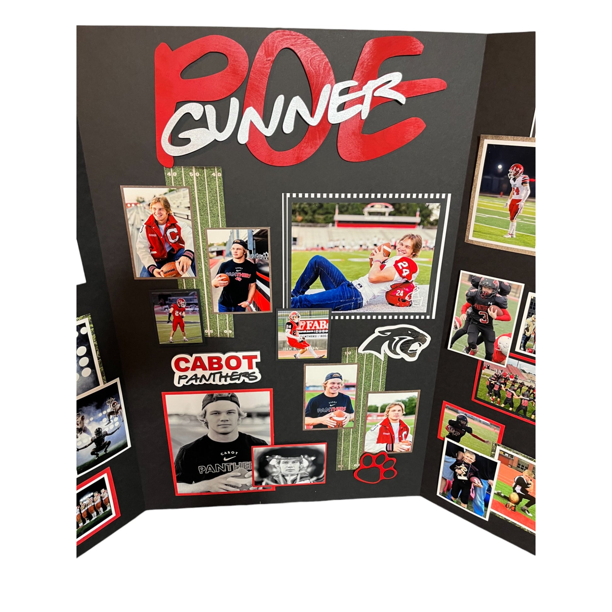The LEVEL 2 builds on our base package (level 1) for Senior boards. The base layer is a 36" x 48" tri-fold, black, foam-core board, showcasing up to 15 pictures. Also included is a wood cut out name, 4 themed accessories (football shown), and one message (bible verse or quote).