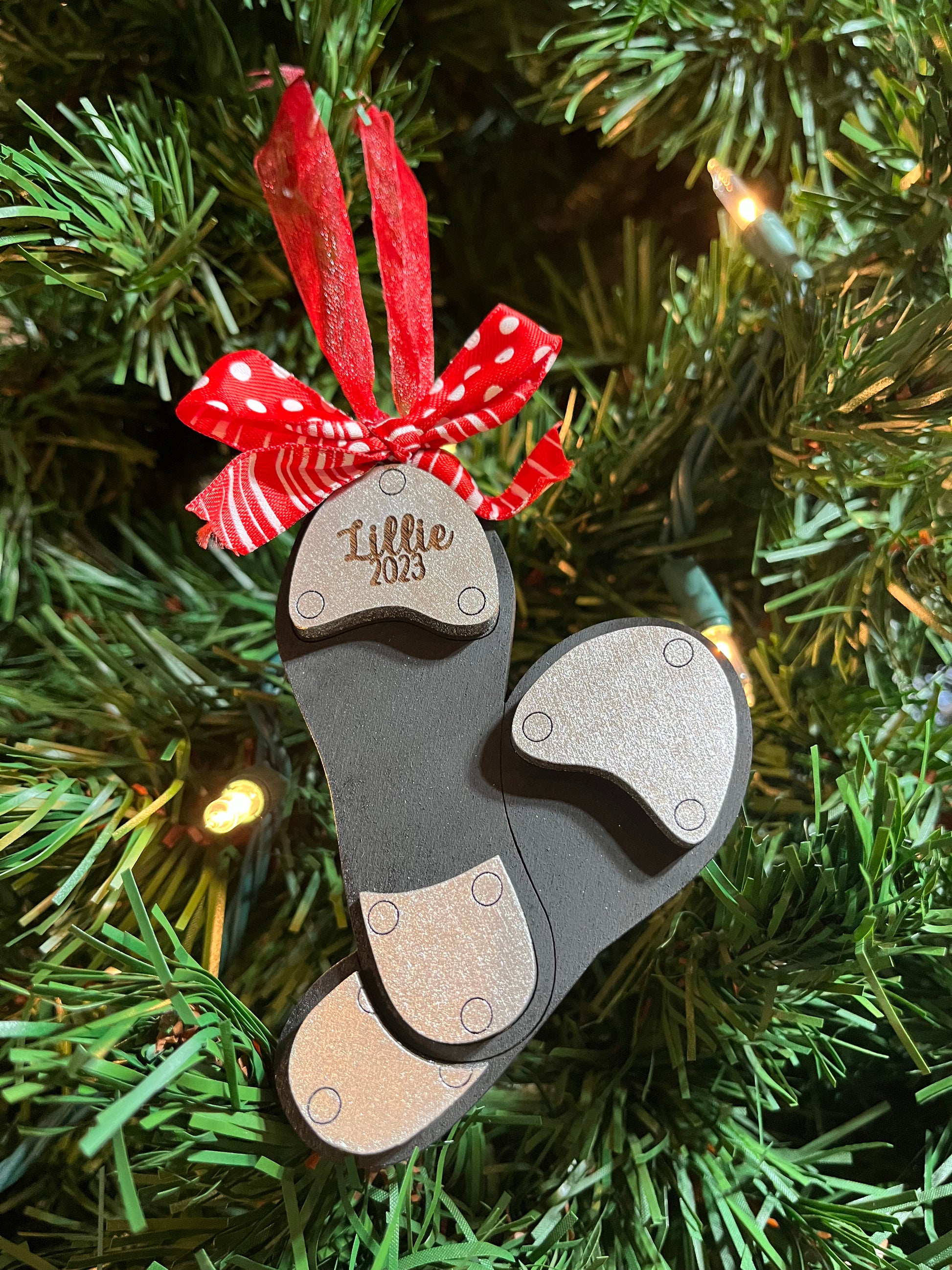 Bring the magic of dance into any Christmas Tree with this personalized tap shoe ornament! Perfect for any tiny dancer, this charming double layered ornament is sure to bring cheer to every space. Tap into your (or you little dancer's) love of dance with this adorable addition!